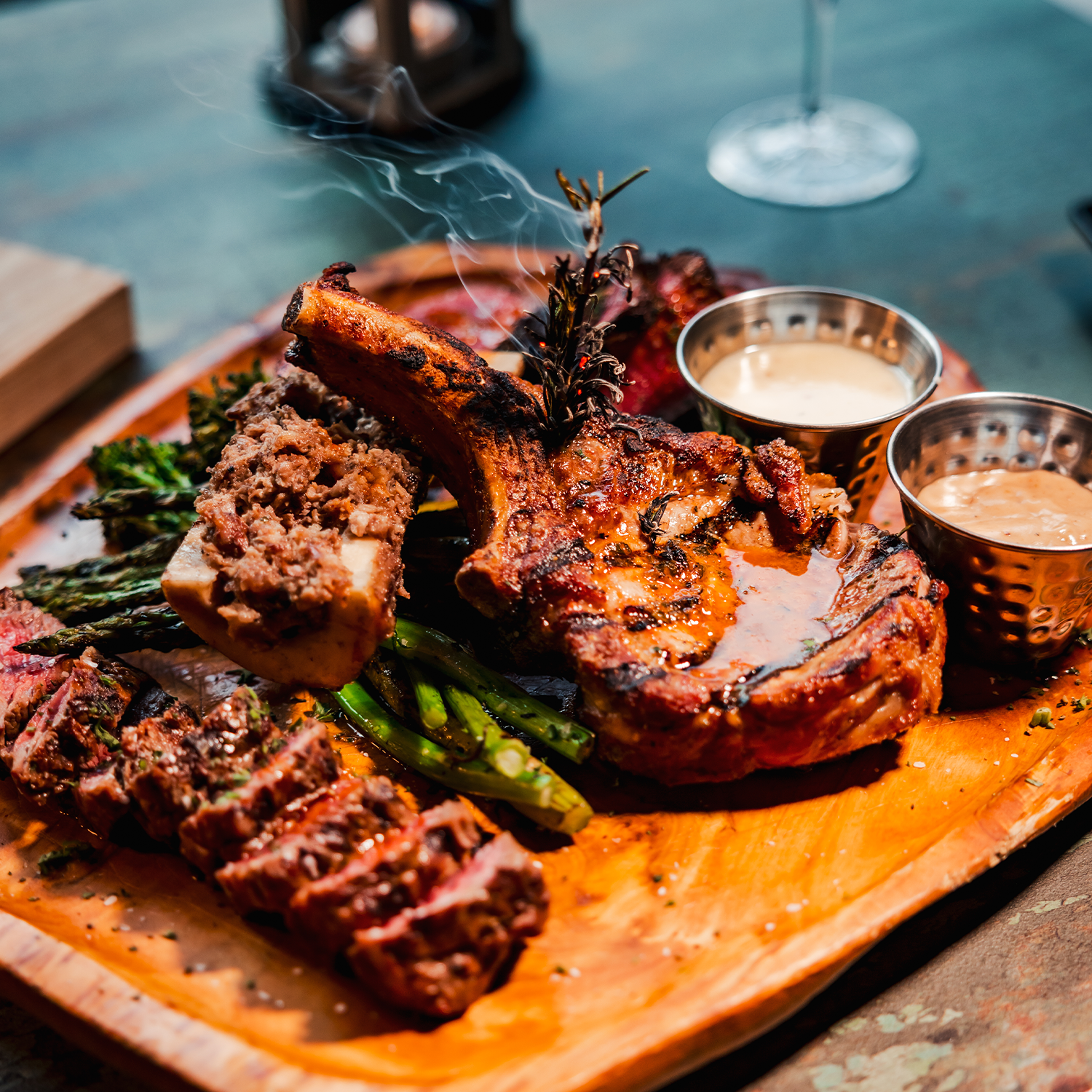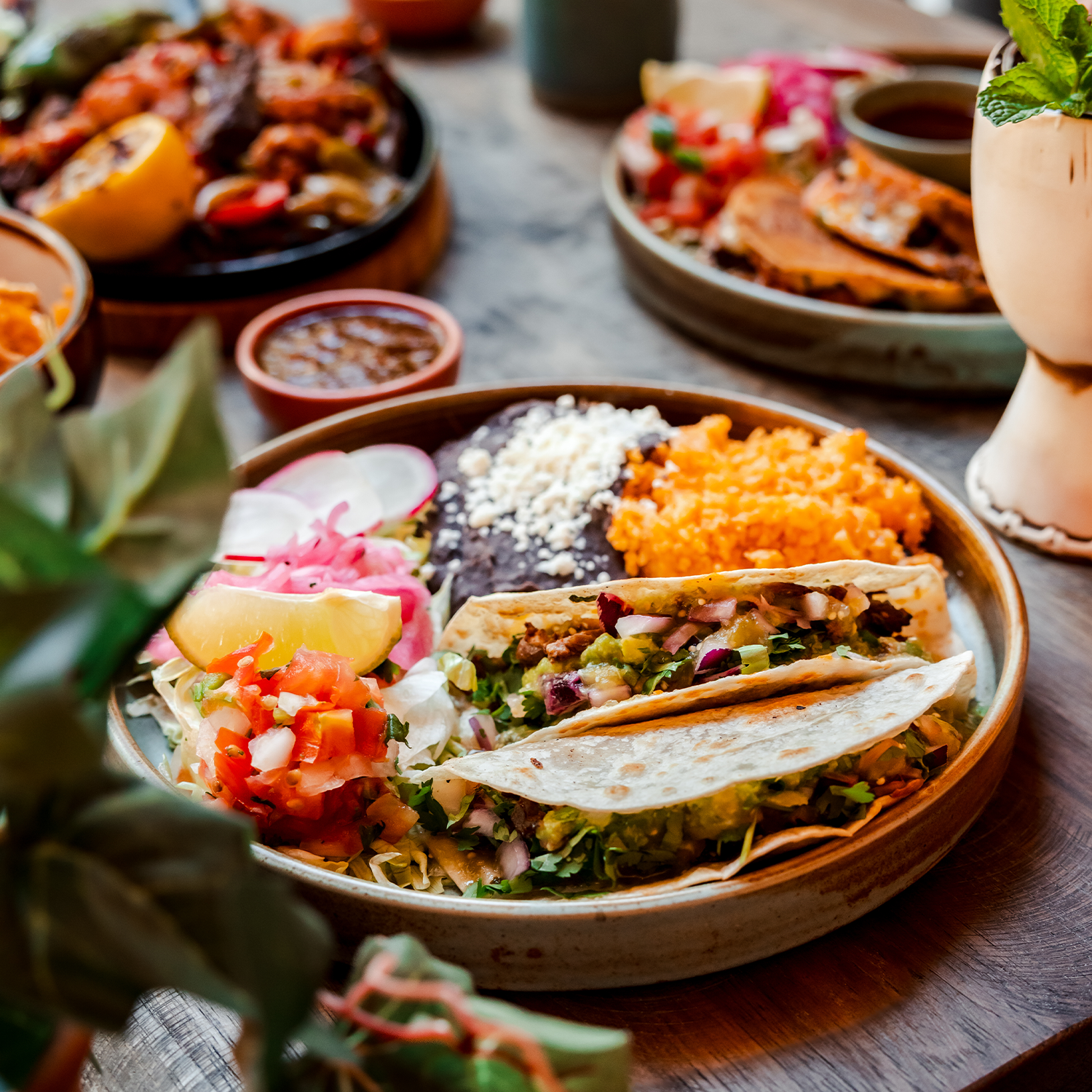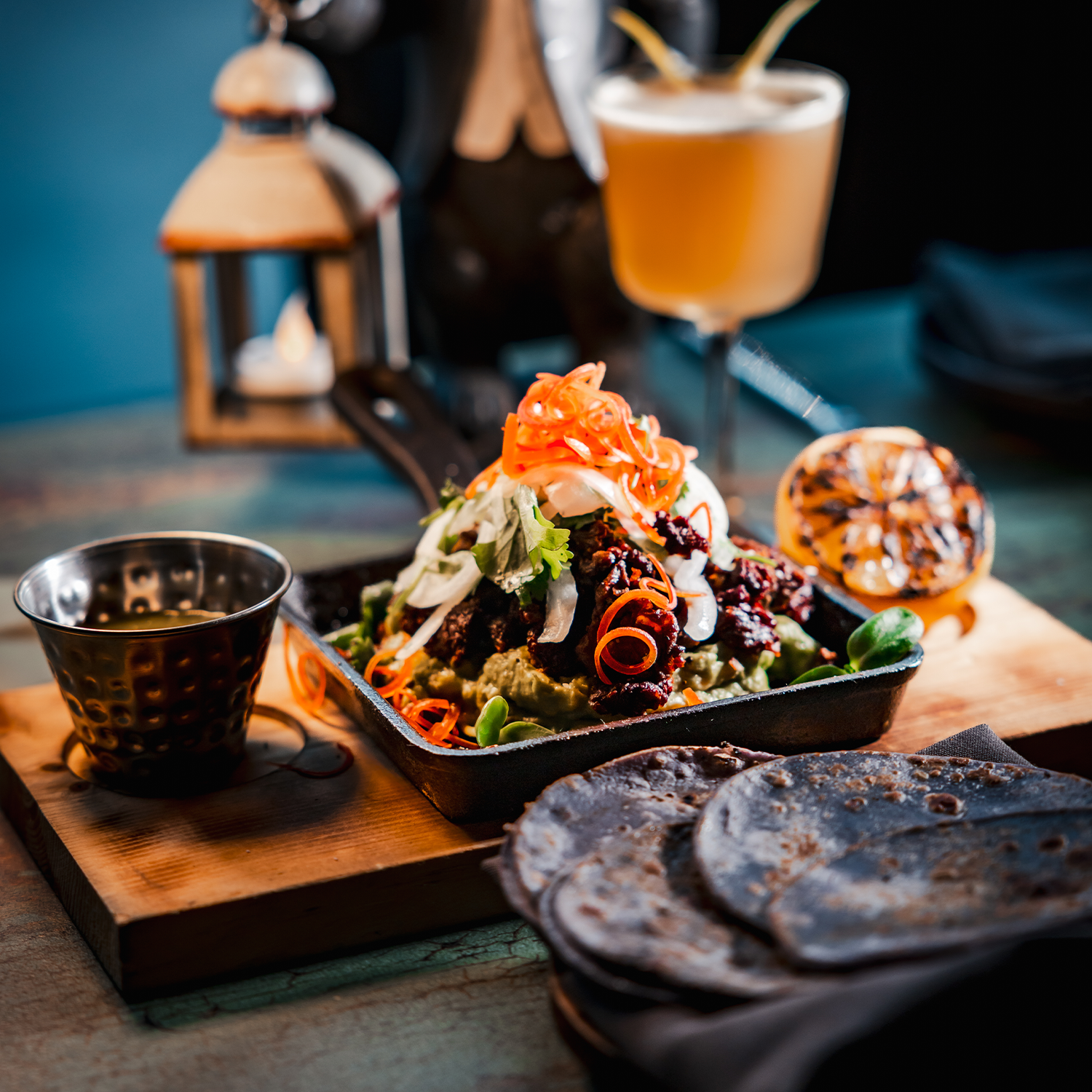 Crispy ribeye chicharron on fresh guacamole, served with salsa macha and blue corn tortillas.