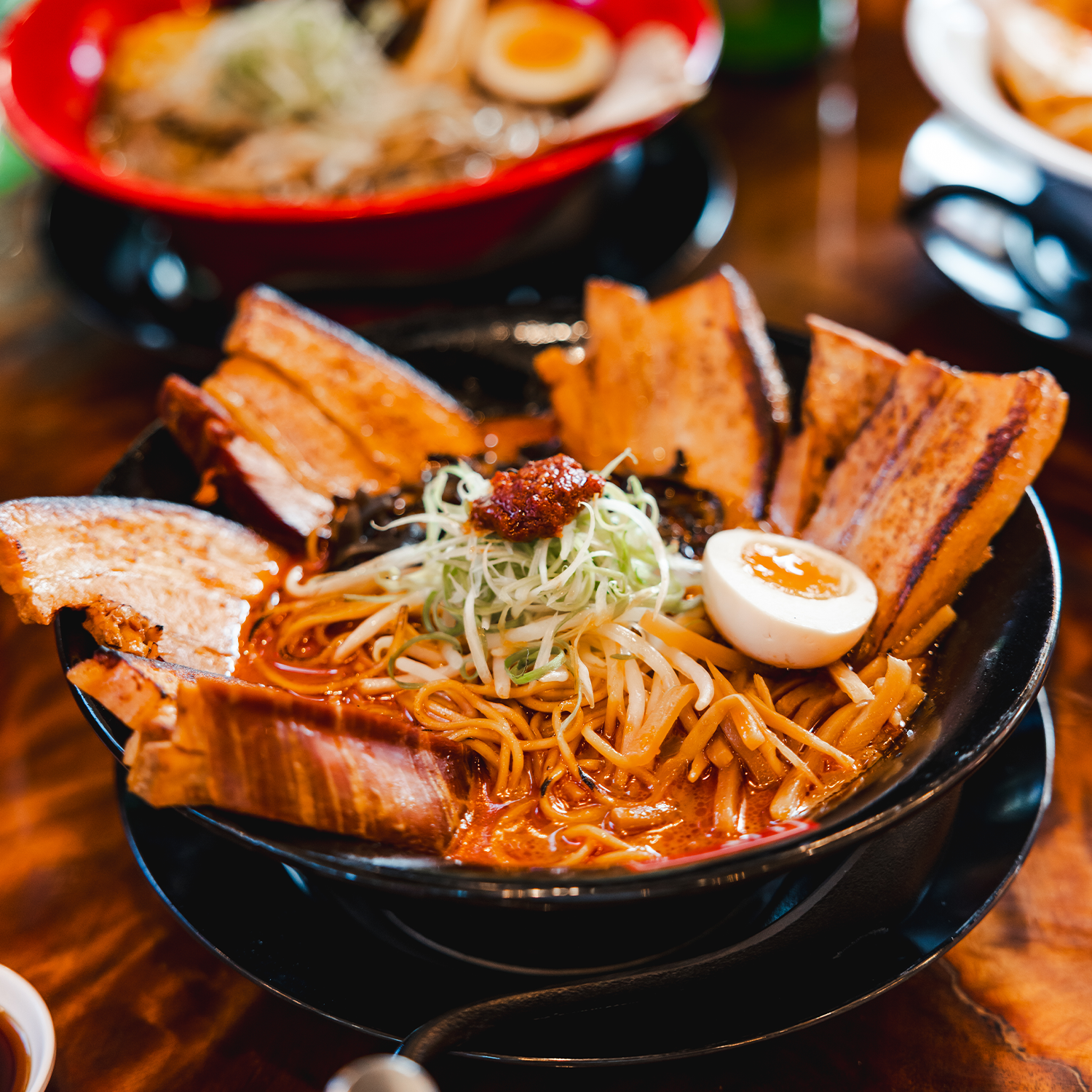 Spicy black garlic tonkotsu loaded with four pieces of pork belly chashu, homemade ramen noodles, and all the traditional toppings that make Chef Dustin’s bowls legendary.